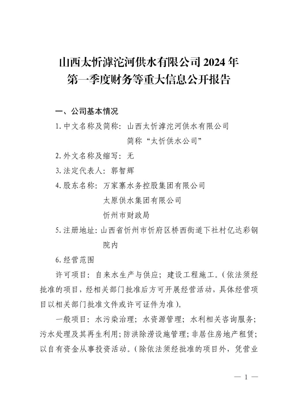 2024年一季度財務等重大信息公開報告